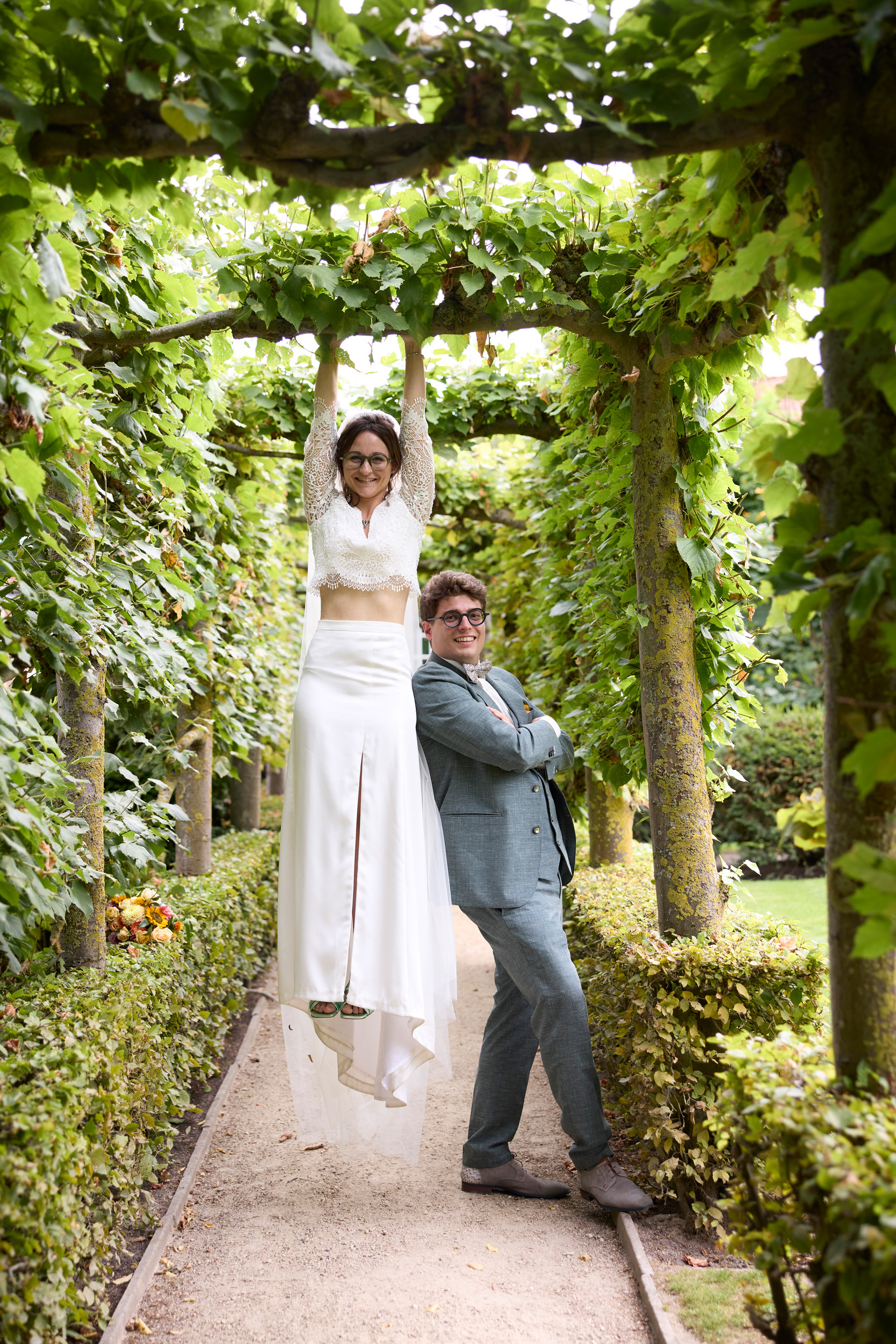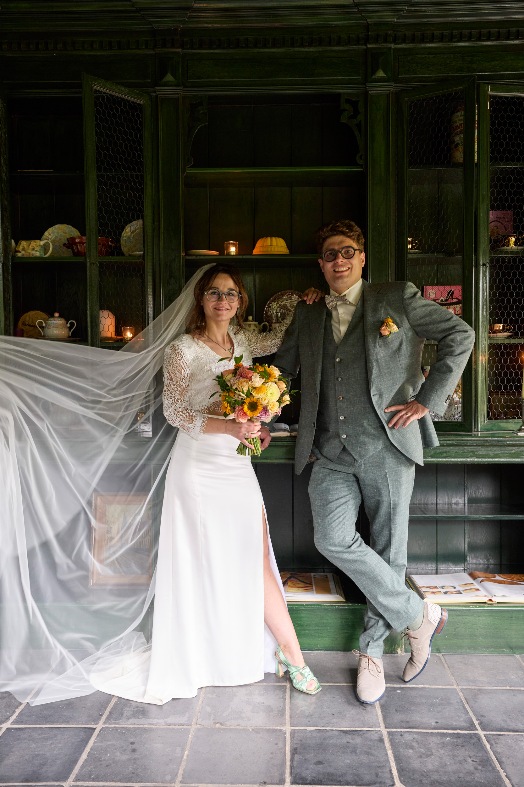 Ik was verbaasd toen Kaspar na één pasmoment zijn volledige kostuum gekozen had. Achteraf snapte ik helemaal waarom. Ik had geen enkel idee hoe zijn kostuum eruit zou zien, en dat maakte het moment op onze trouwdag des te specialer. Het kostuum was tot in de kleinste details perfect afgewerkt en paste helemaal bij hem. De persoonlijke inscriptie in de kraag en vest maakte het nóg unieker. We willen jullie bedanken voor de professionele, warme en aangename begeleiding. Jullie vakmanschap straalde in elk detail. ❤️